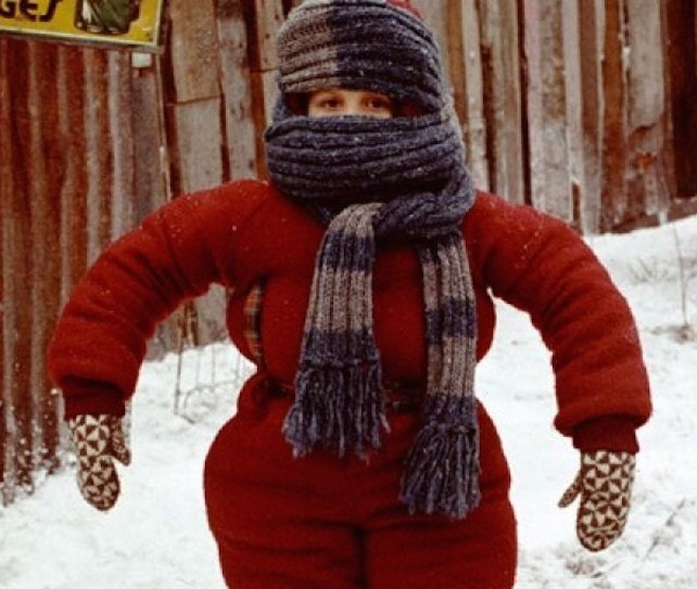 Pictured above, Ralphie’s famous snow suit scene from A Christmas Story, 1983 and an example of a sleep suit (Magic Merlin)